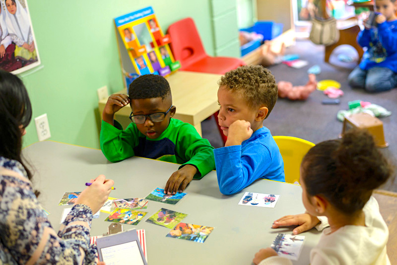 In the Preschool classroom, 3-year-olds build confidence and independence through language-rich activities such as reading, singing, finger plays, and simple conversations with teachers and friends. These experiences encourage listening, vocabulary growth, and social interaction, helping children learn to express themselves and work together in small groups.